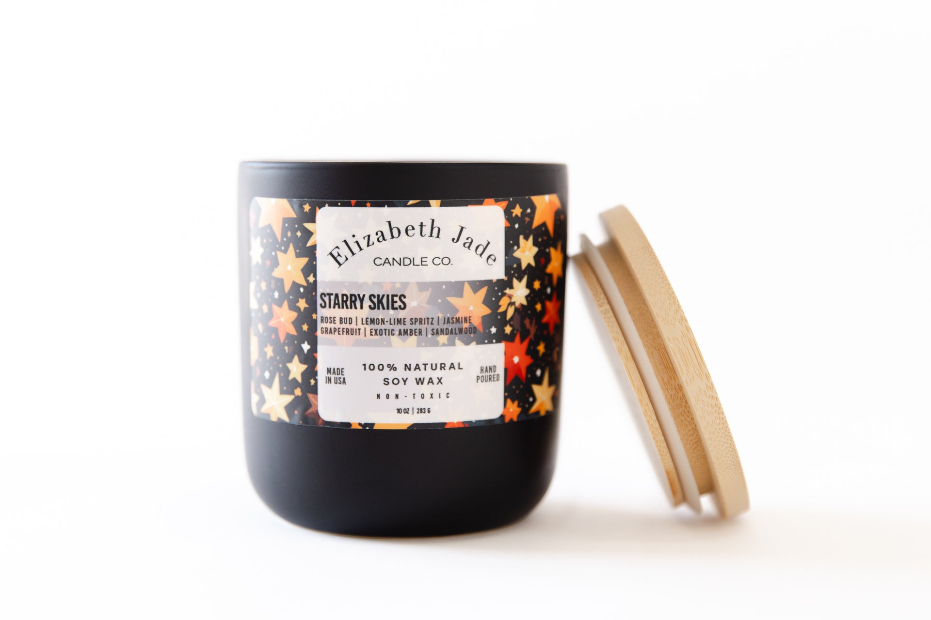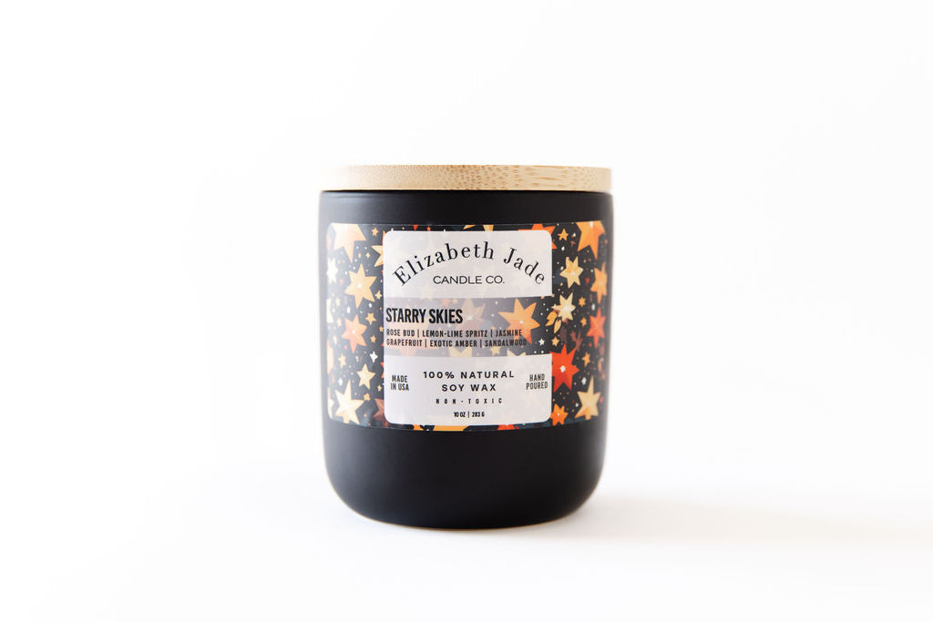 Let the evening unfold with Starry Skies, a scent inspired by the magic of a starlit night. This candle opens with the bright allure of bergamot, lemon-lime spritz, and a hint of rose bud, creating an air of intrigue. As the fragrance deepens, notes of spicy cardamom, fresh melon, and rich jasmine emerge, blending effortlessly with a touch of grapefruit. The journey finishes on a warm, exotic foundation of amber, vanilla, and sandalwood, wrapping you in a sophisticated, sultry aroma. Perfect for nights when you're dreaming big or simply unwinding, Starry Skies brings the charm and depth of the cosmos into your space.